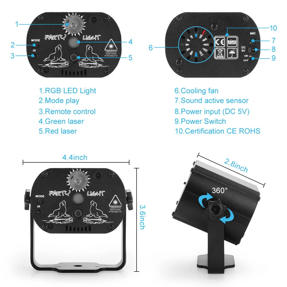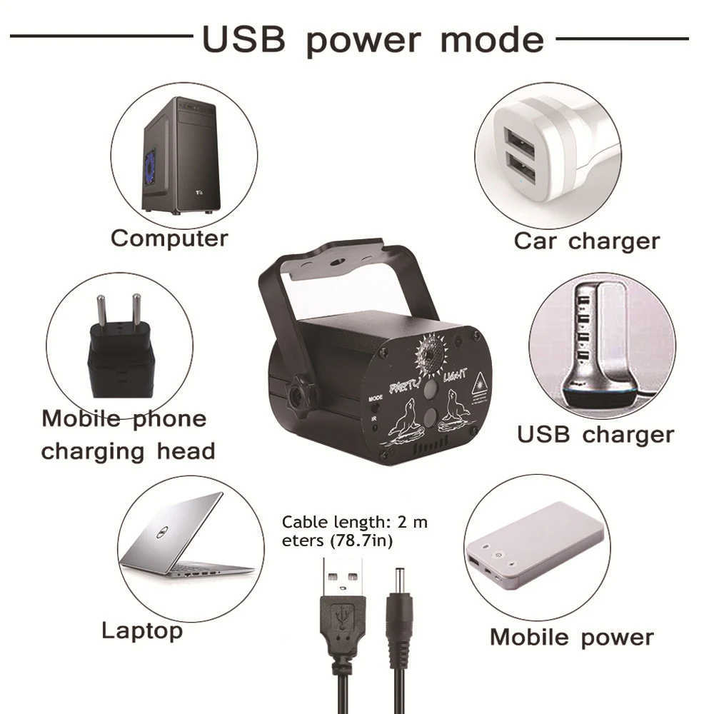 1. Taa hii ya mini ya leza imetengenezwa kwa nyenzo ya alumini, ambayo ni thabiti sana na yenye nguvu sana. Taa hii ya Laser ya Hatua iliendeshwa kupitia kebo ya USB iliyokuja na kifaa, bandari ya USB inaweza kuchajiwa kwa kompyuta, power bank au kifaa chochote chenye USB. bandari.