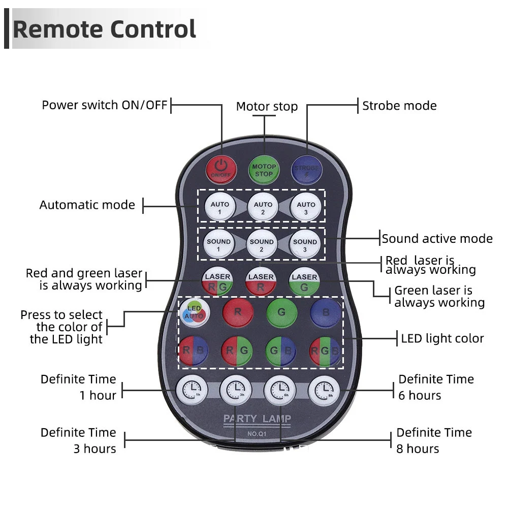 2. Kidhibiti cha mbali cha IR,Ikilinganishwa na taa nyingine za jukwaani zinazobebeka, taa zetu za leza zisizo na waya zimeundwa kwa hali ya kuwezesha sauti au hali ya akili, unaweza kubadili kwa urahisi kati ya modi hizo mbili kwa kubofya kitufe. nguvu ya udhibiti wa mbali kwa betri 2*CR2025 (Betri Haijumuishi kwenye kifurushi)